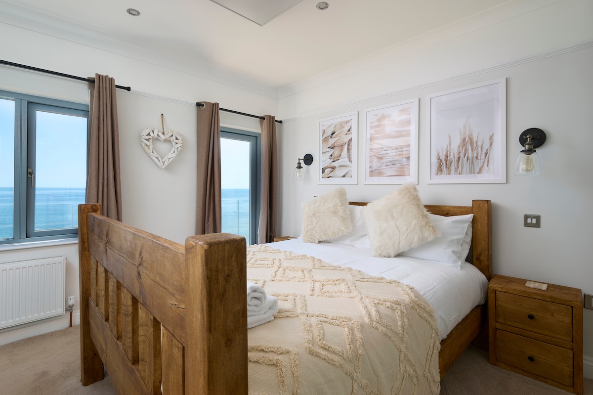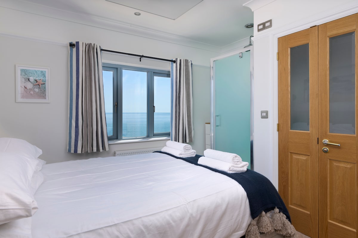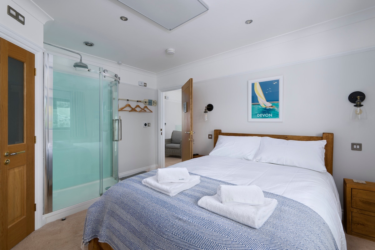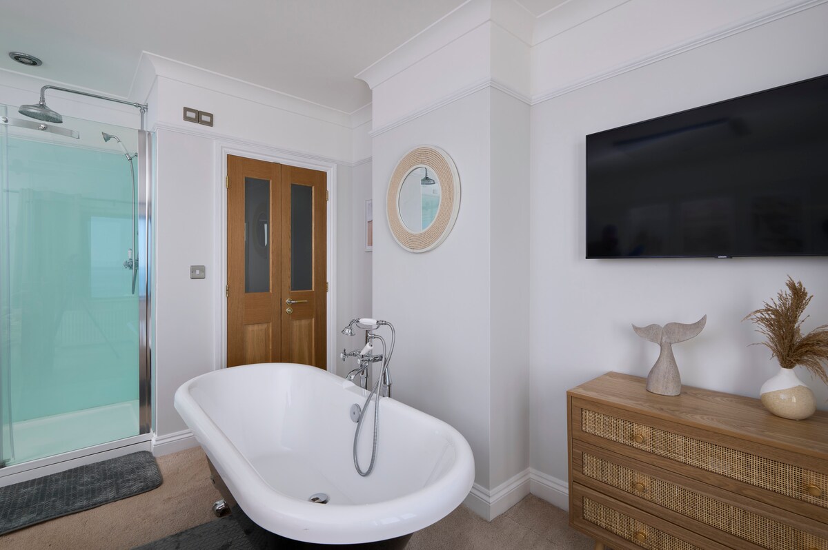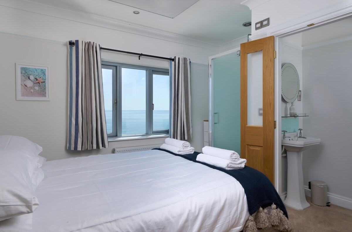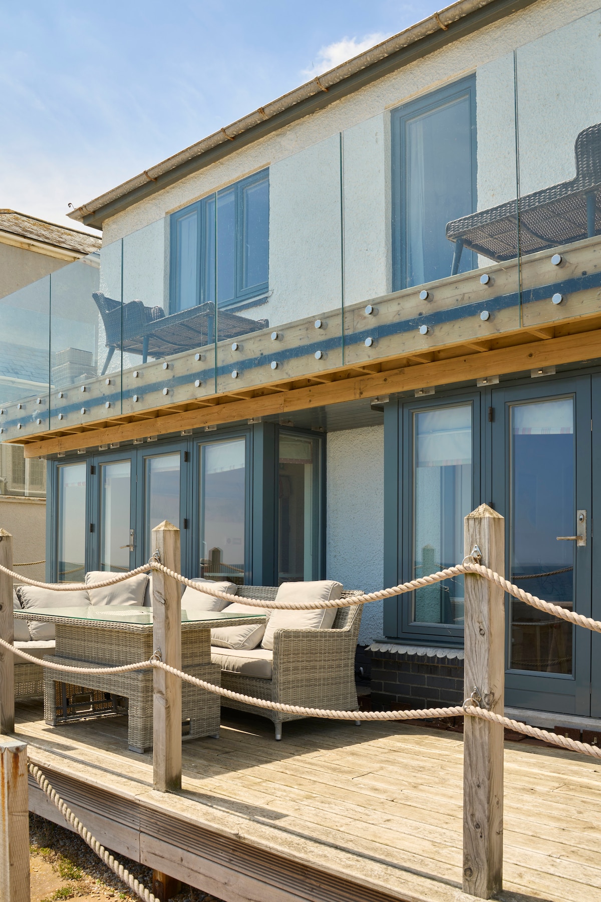 Upstairs, handsome cottage oak doors lead the way to the master bedroom, the Sea King. This has the luxury of a roll top free standing bath, shower and en-suite, king size oak bed and direct access to the fully glazed balcony running across the whole frontage of the property. Imagine sunrise from this space! All four of the generous double bedrooms, have full sized showers and en-suites. All decorated in clean off-white, Bedroom 2 and 3 overlook the wildlife rich Ley, whilst bedroom 4 enjoys the same fabulous views over the beach as the master.