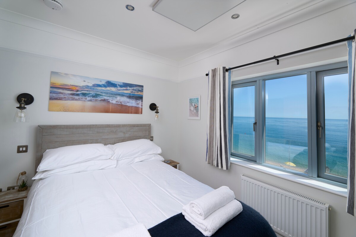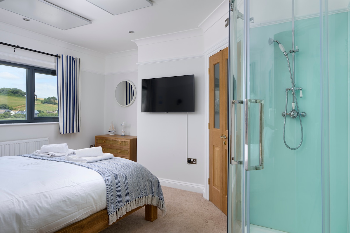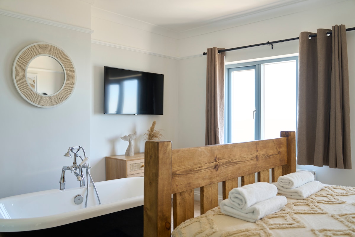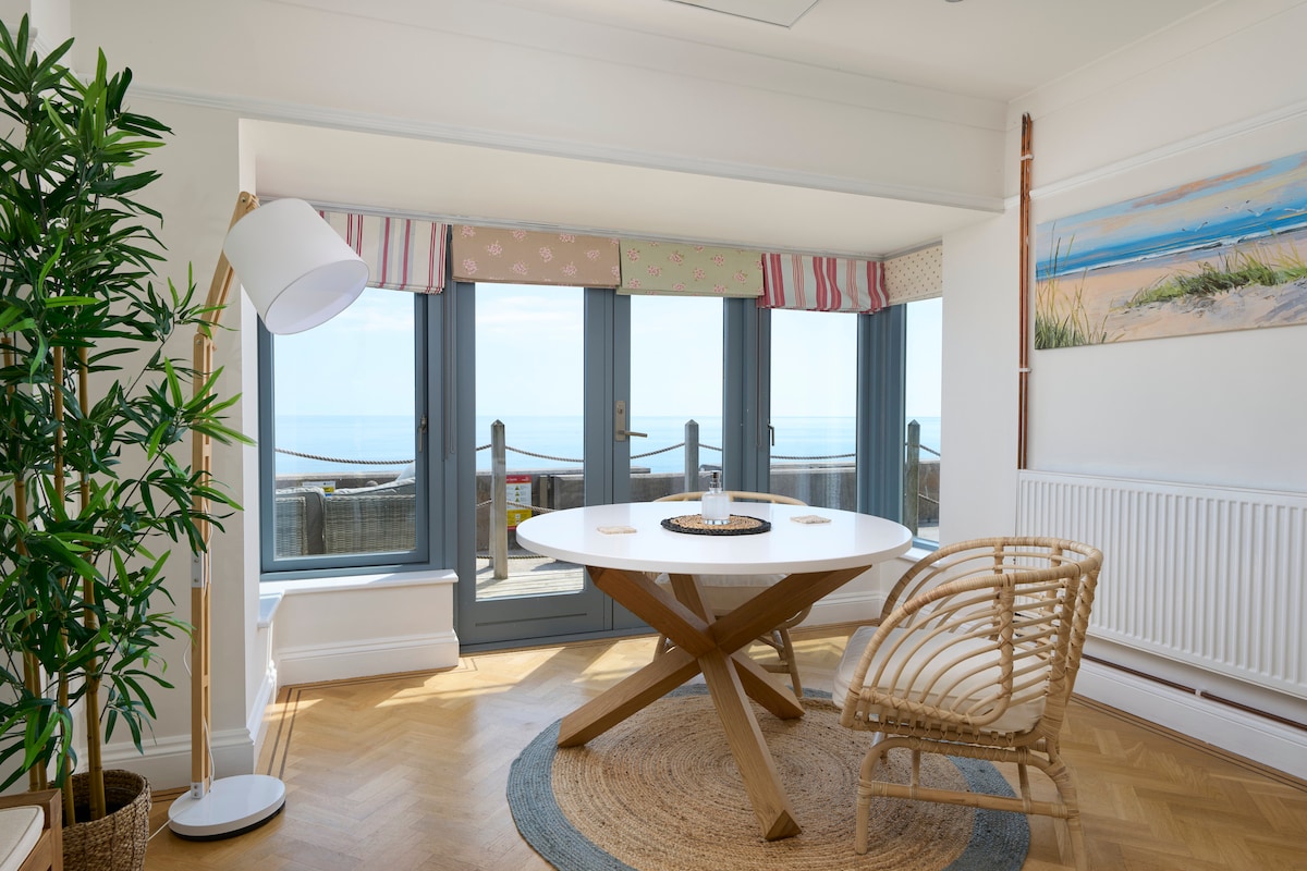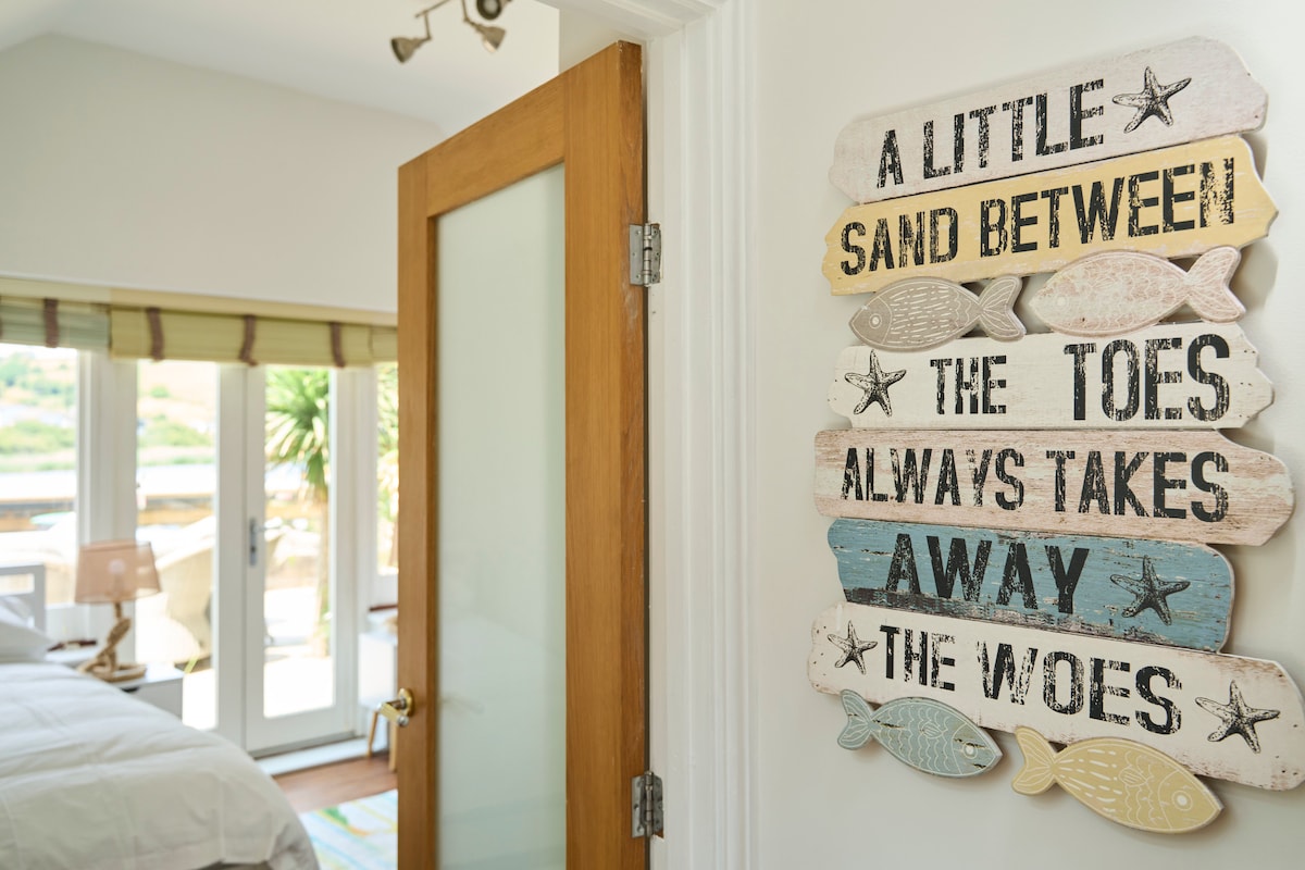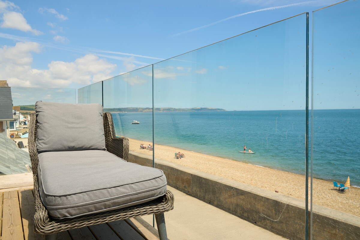 Upstairs, handsome cottage oak doors lead the way to the master bedroom, the Sea King. This has the luxury of a roll top free standing bath, shower and en-suite, king size oak bed and direct access to the fully glazed balcony running across the whole frontage of the property. Imagine sunrise from this space! All four of the generous double bedrooms, have full sized showers and en-suites. All decorated in clean off-white, Bedroom 2 and 3 overlook the wildlife rich Ley, whilst bedroom 4 enjoys the same fabulous views over the beach as the master.