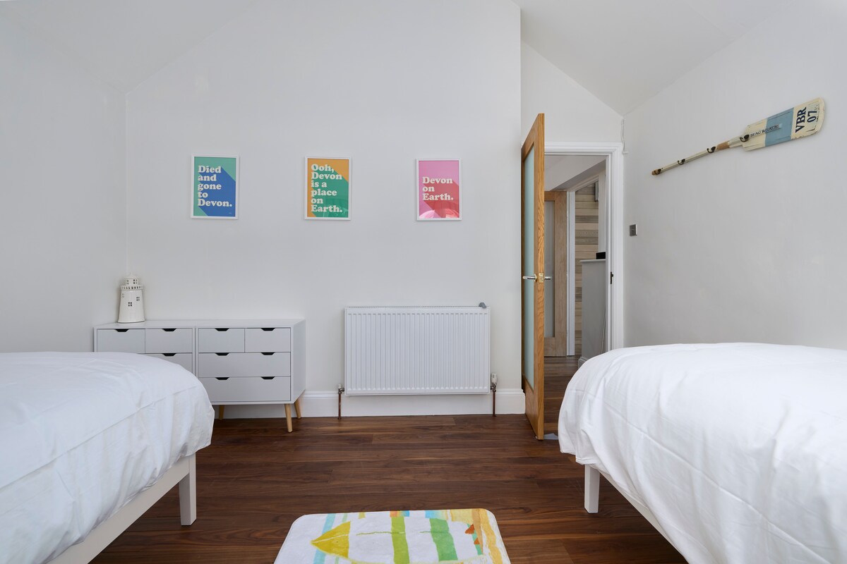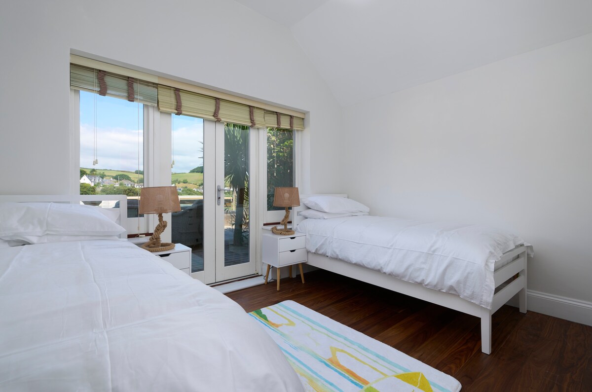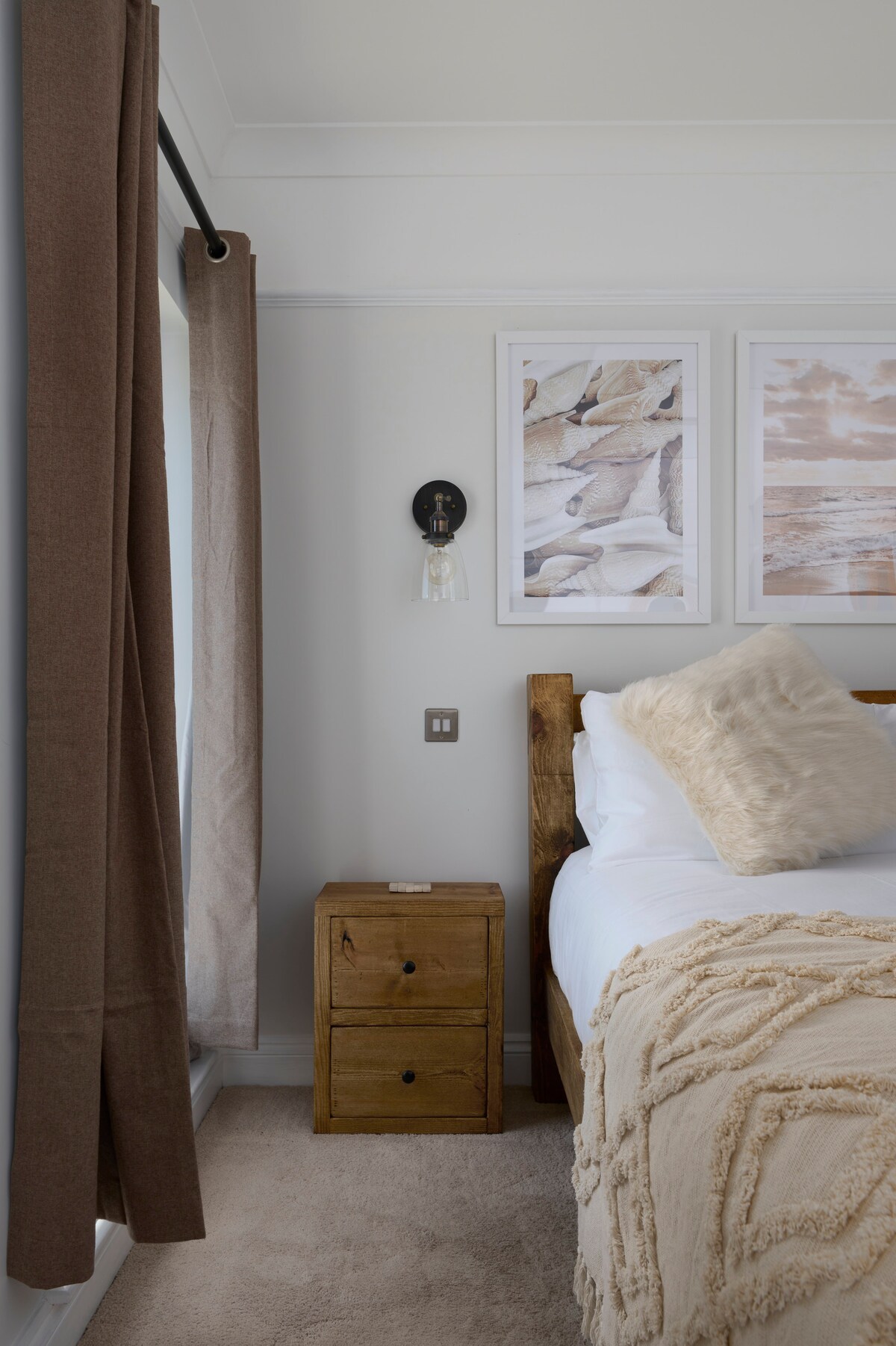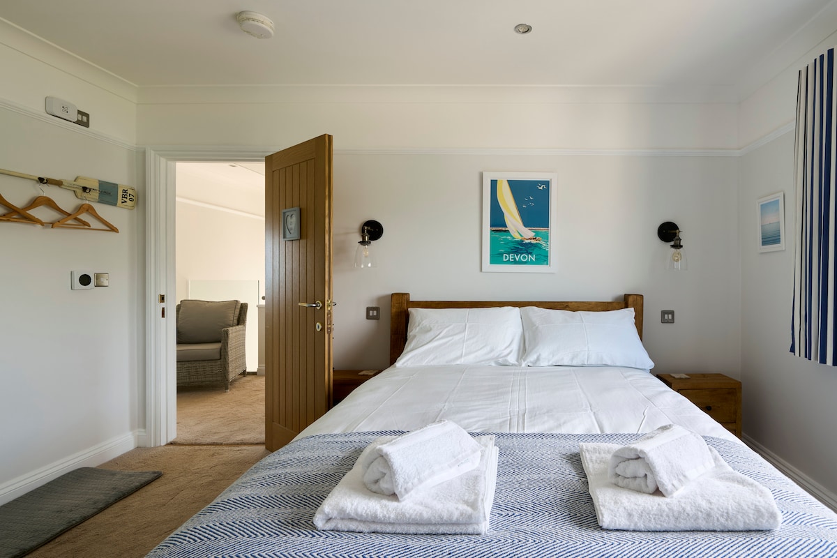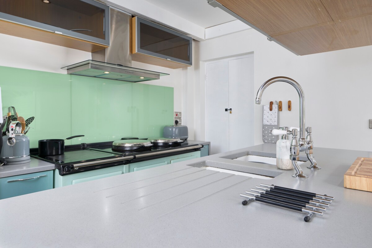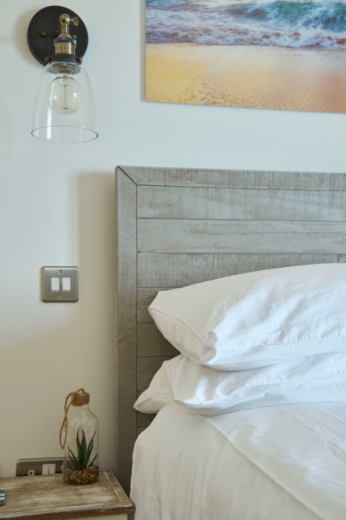 Upstairs, handsome cottage oak doors lead the way to the master bedroom, the Sea King. This has the luxury of a roll top free standing bath, shower and en-suite, king size oak bed and direct access to the fully glazed balcony running across the whole frontage of the property. Imagine sunrise from this space! All four of the generous double bedrooms, have full sized showers and en-suites. All decorated in clean off-white, Bedroom 2 and 3 overlook the wildlife rich Ley, whilst bedroom 4 enjoys the same fabulous views over the beach as the master.