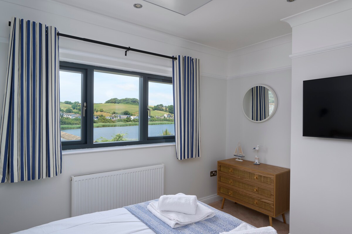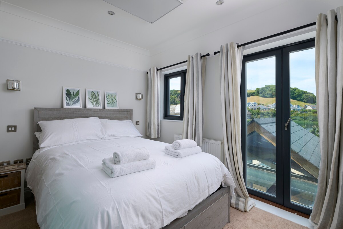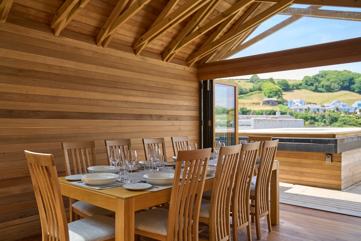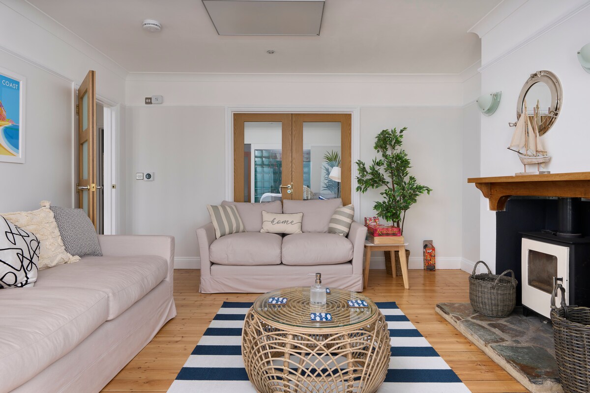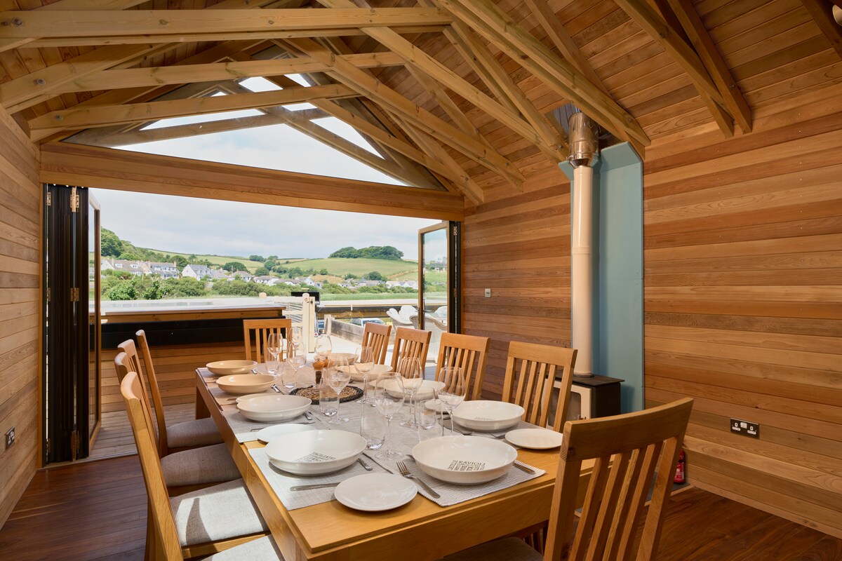 Through to the main lounge, you’re welcomed by the roaring log burner in the statuesque fireplace. Pause and admire the sensational view from the second fully glazed bay window, again with French doors accessing the front deck. The three seater sofa in this room features as a fantastic sofa bed.