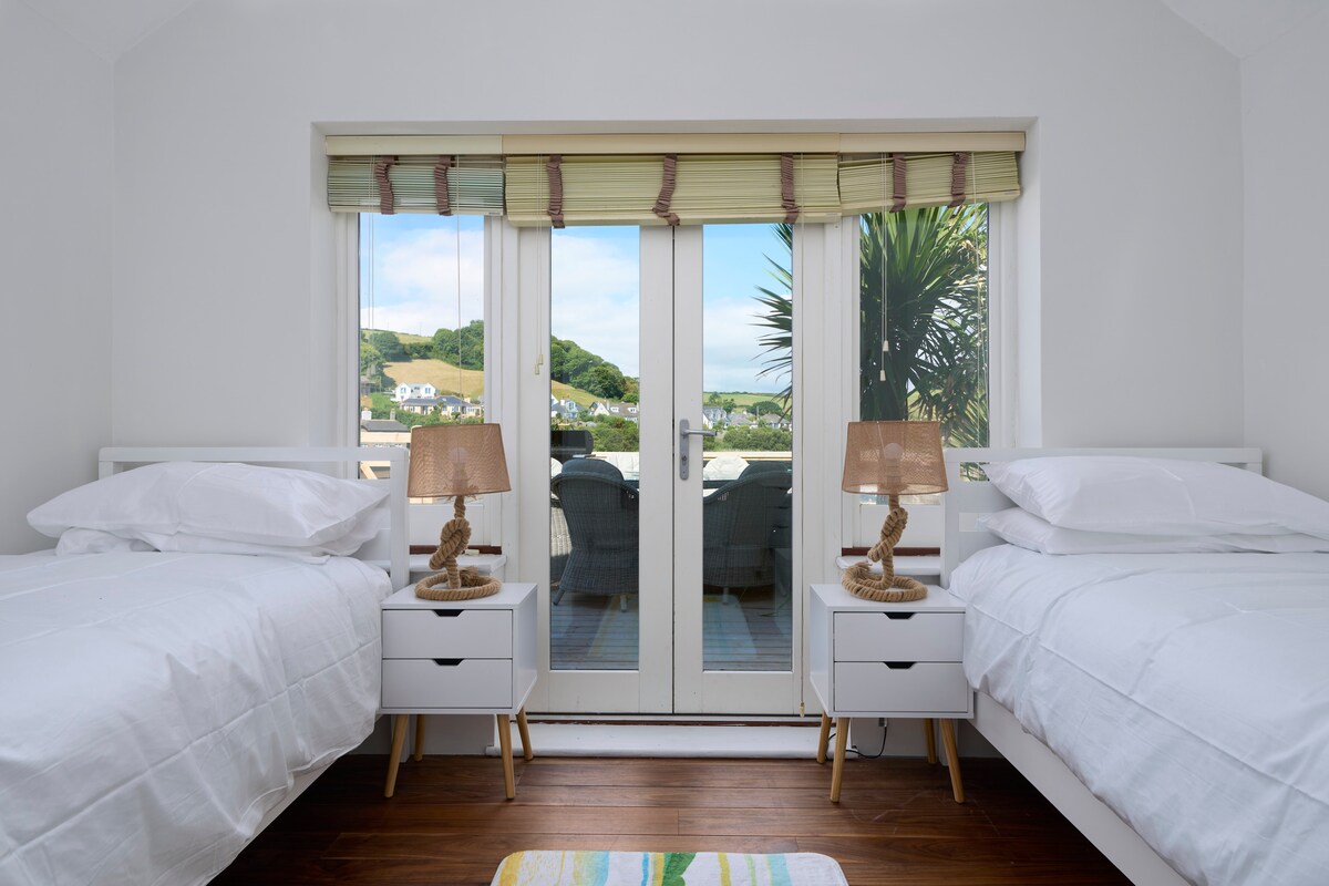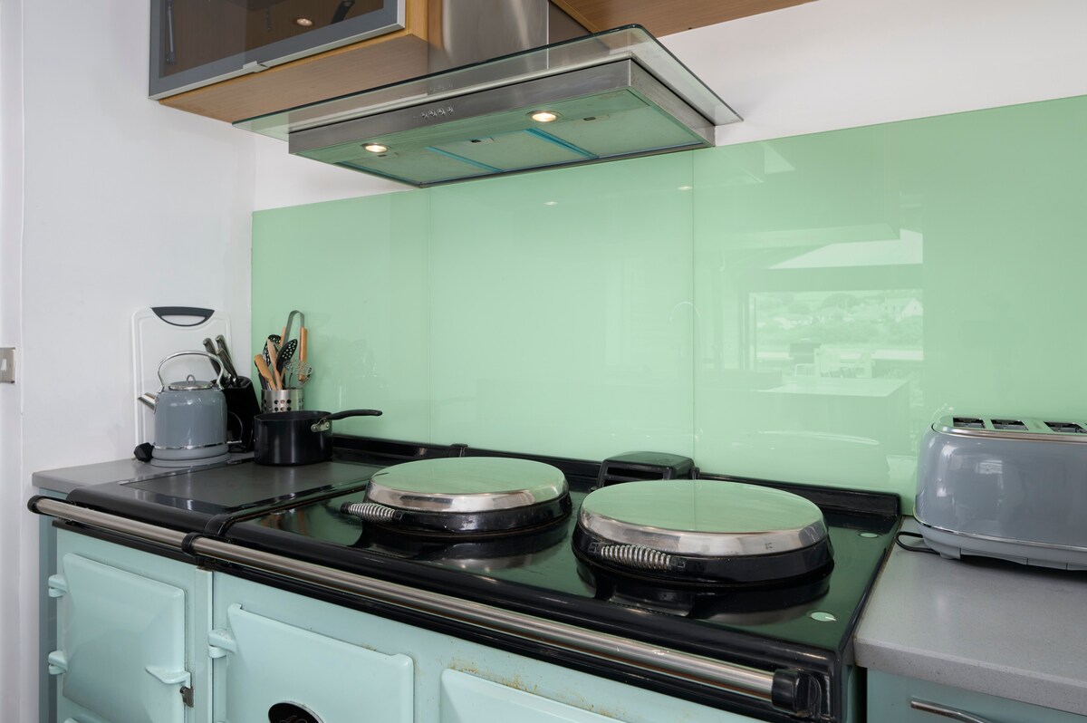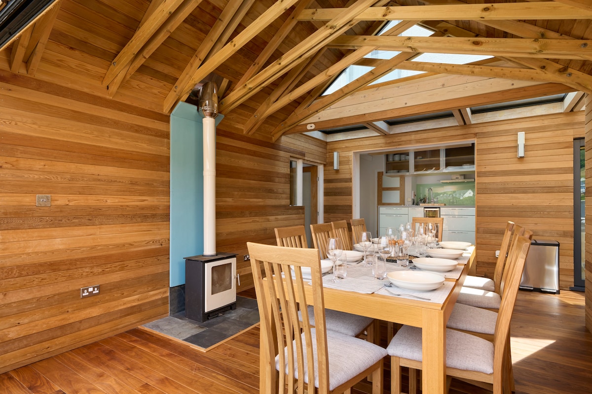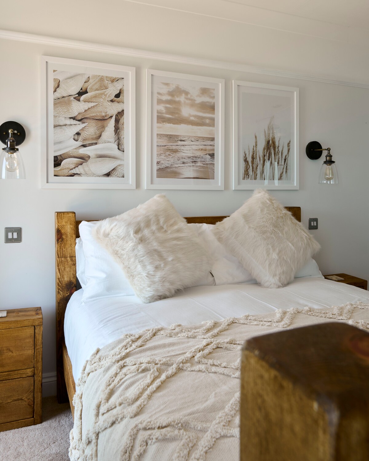 Through to the main lounge, you’re welcomed by the roaring log burner in the statuesque fireplace. Pause and admire the sensational view from the second fully glazed bay window, again with French doors accessing the front deck. The three seater sofa in this room features as a fantastic sofa bed.