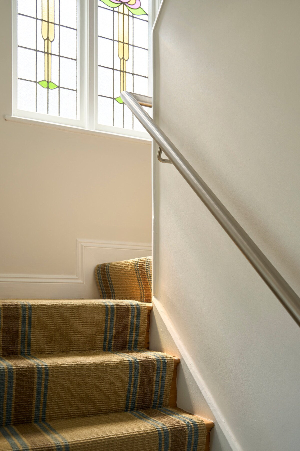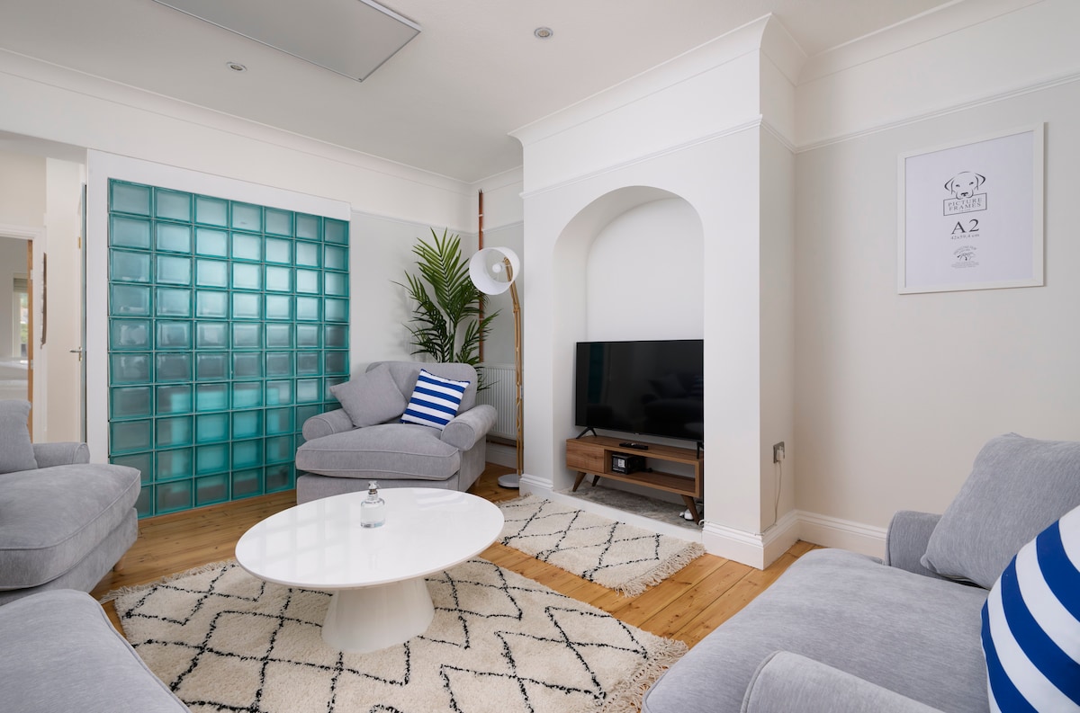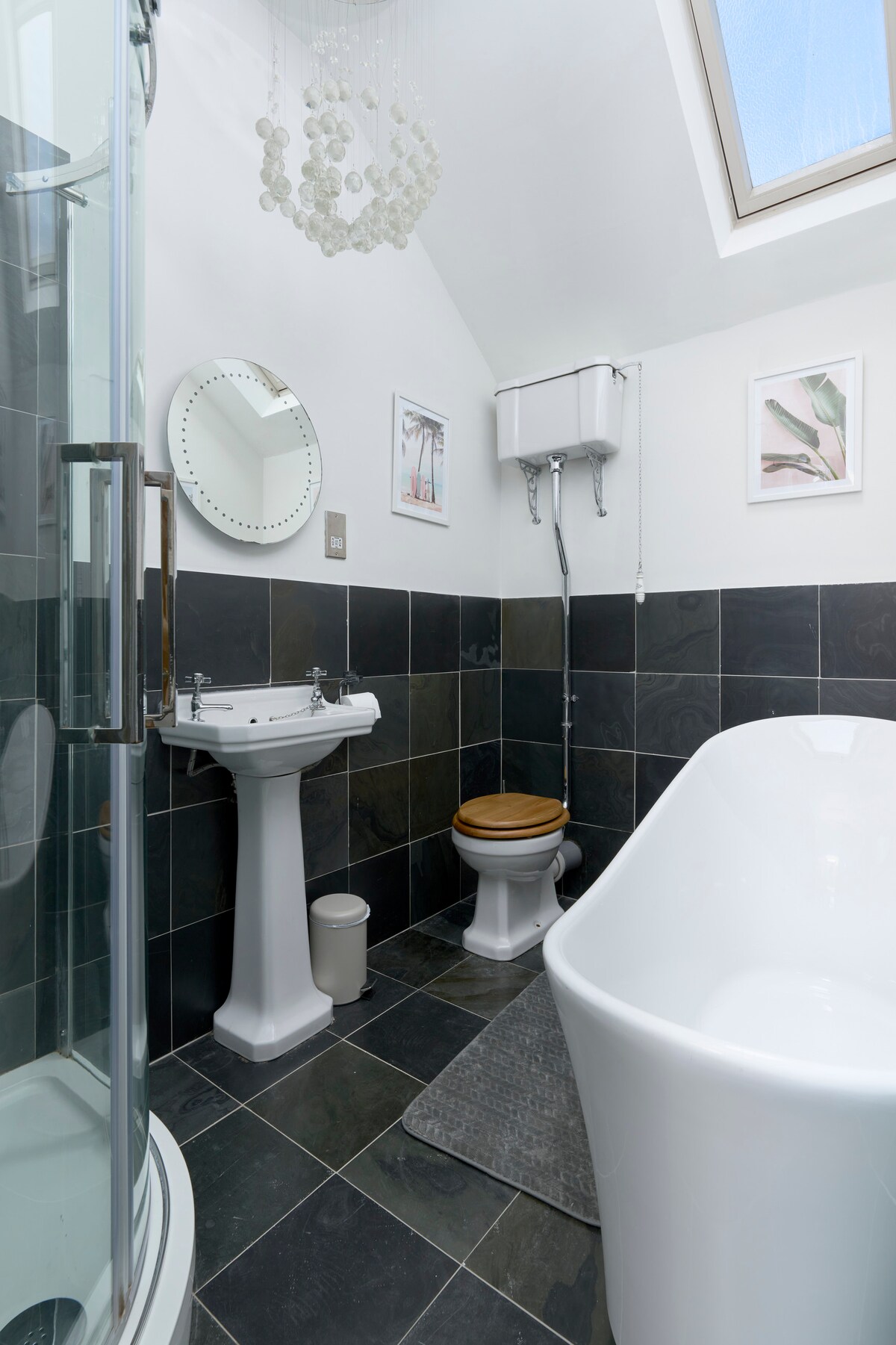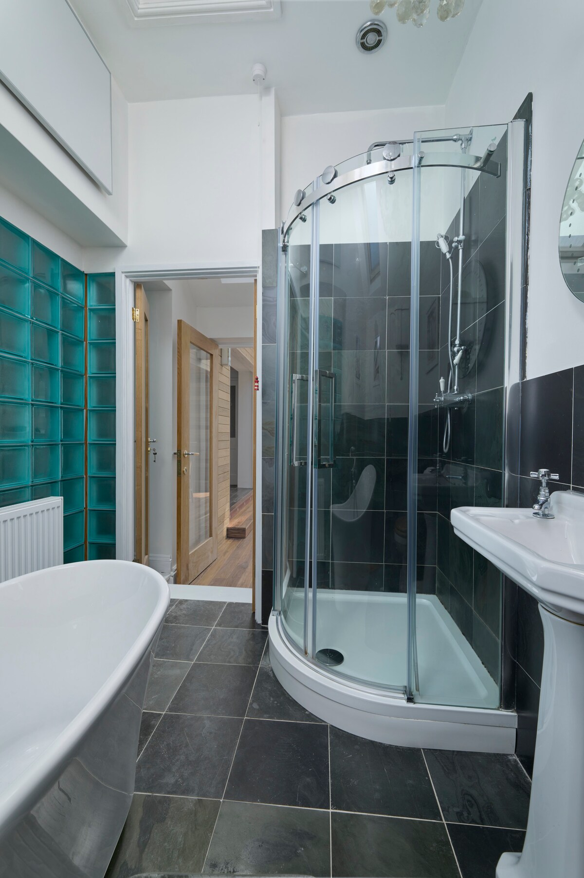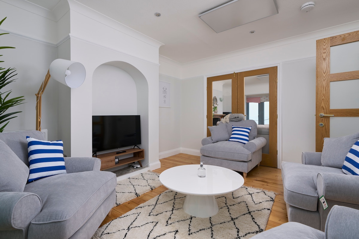 Original wooden flooring runs seamlessly through a pair of wide, fully glazed oak French doors, connecting the main lounge to the snug. When open, a continuous open plan room is created, flowing from the front to the rear of the house to form one large entertaining space. Closing the doors creates the cosy snug with four large chairs and a table, perfect for boardgames or a quieter space for family. Walking towards the rear we have a stylish and practical ground floor family bathroom and a good sized fifth bedroom beyond, with glazed French doors giving access to the expansive rear deck.